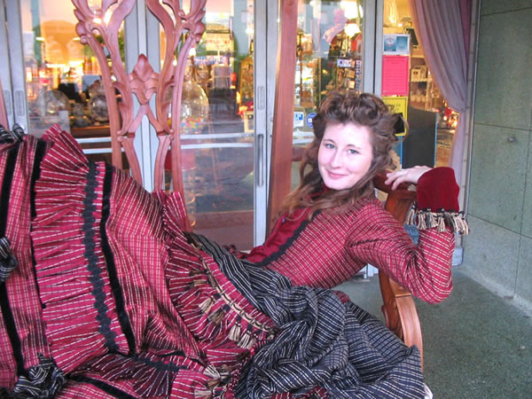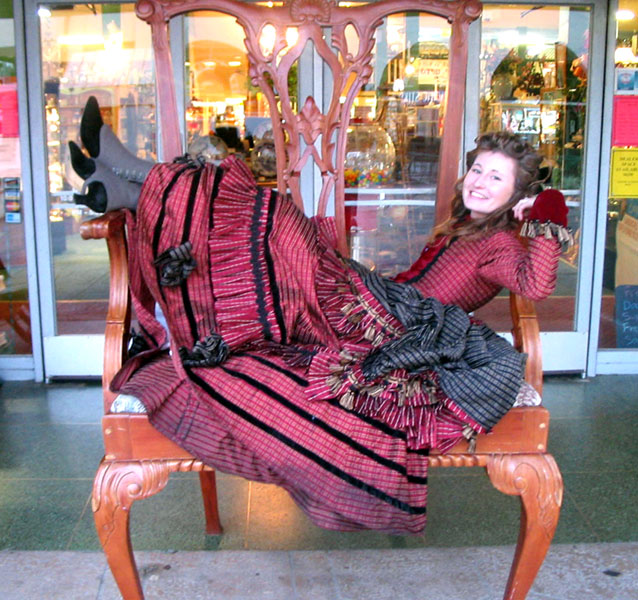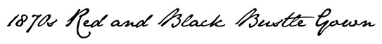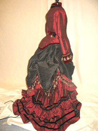 My first true attempt at a Victorian gown, this was made for the Riverside Dickens Faire in 2005. The bodice was from Patterns of Fashion by Janet Arnold and the skirt was from Truly Victorian. The overskirt was my own creation. This used contrast of red and black silk with a stripe pattern woven into it and velvet for accents. Self pleats, braid, and tassels are trimming.