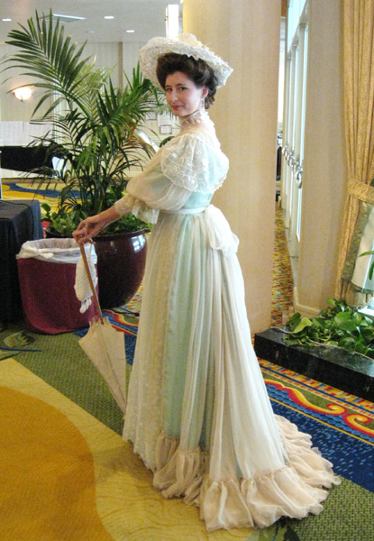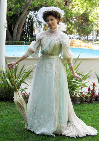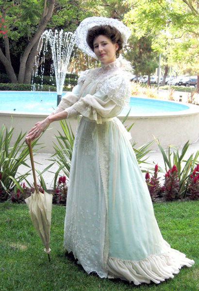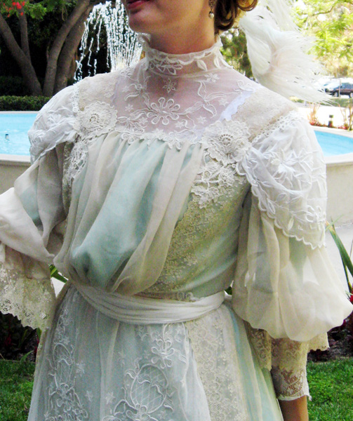 This dress was made of light tan silk chiffon over a light greenish blue silk crepe. It is trimmed in antique lace and also embroidered cotton netting, repurposed from a vintage curtain. More information on this project can be seen on my blog in a short dress diary.