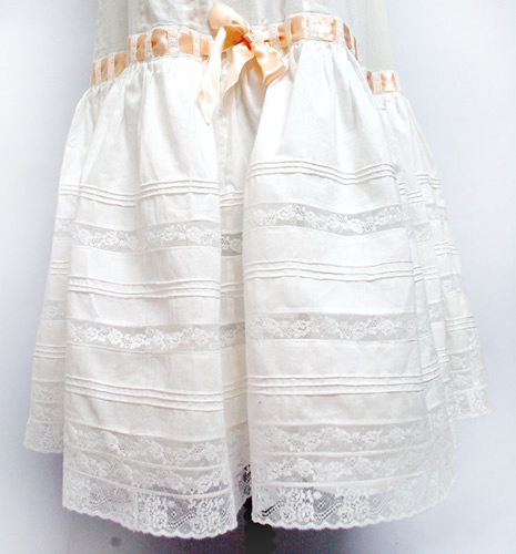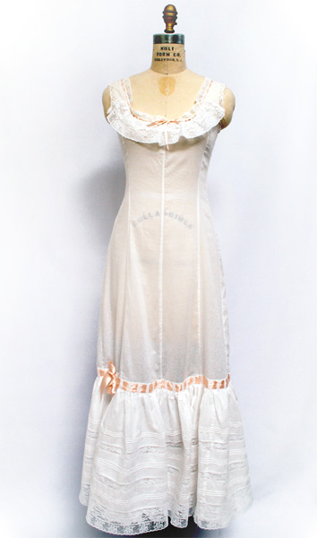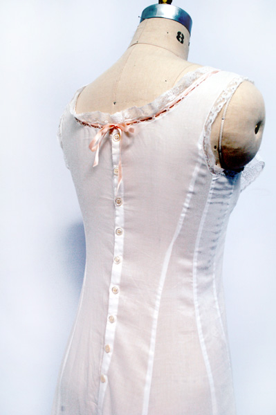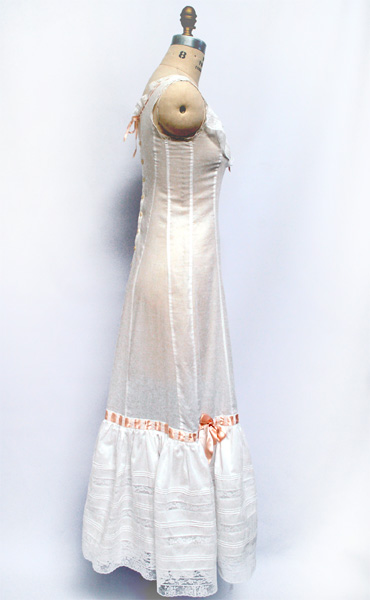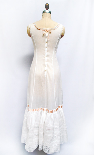 This slip is made of white cotton batiste with white French cotton lace and beading through which is threaded a silk satin peach/pink ribbon that ties at a bow at the center front and center back. The slip buttons up the back with antique mother of pearl buttons.