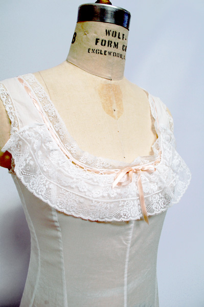This Edwardian princess slip was made as part of my wedding trousseau. It was made from one of the Frances Grimble books, either The Edwardian Modiste, page 344. The slip ran small and I had to add panels down the sides. I had thought I made it from a Past Patterns reprint but was mistaken, and when I ran across the pattern the other day I came back to change this page with the correct information.