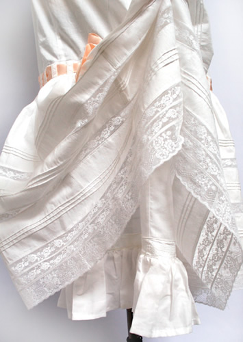 This slip ran smaller than expected so was pieced at the side. The whole slip is constructed with French seams and traditional French heirloom sewing techniques. Underneath the top ruffle at the skirt is an additional smaller ruffle near the hem to add fullness. I added a ruffle at the front bodice, copying a popular technique of adding "bust improvers" through ruffles on undergarments. At the top of the outer skirt gathers is wide Swiss embroidered beading through which is threaded a wide silk satin ribbon that ties in a bow at the side.